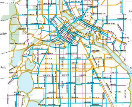 The actions below build upon several of our partner’s planning efforts. These include the Metropolitan Council’s long-term vision for the Regional Bicycle Transportation Network, which identifies regionally significant connections for bicyclists like the extension of the Midtown Greenway across the Mississippi River, as well as the Minneapolis Parks and Recreation Board’s efforts to complete the Grand Rounds trail system, which will be a 50+ mile system of trails in Minneapolis.